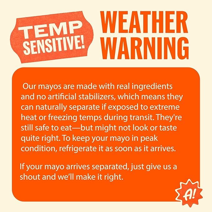 - WEATHER WARNING - Our mayos are made with real ingredients and no artificial stabilizers, which means they can naturally separate if exposed to extreme heat or freezing temps during transit. They're still safe to eat—but might not look or taste quite right. To keep your mayo in peak condition, refrigerate it as soon as it arrives.