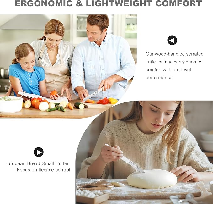- Beyond Bread: Kitchen Versatility Unleashed: From Bakery to Farmer's Market – Slice crusty loaves, score rye dough, then switch to juicy tomatoes, onions, or cantaloupe. One set replaces specialty knives—no more juggling tools for bread baking or fruit prep